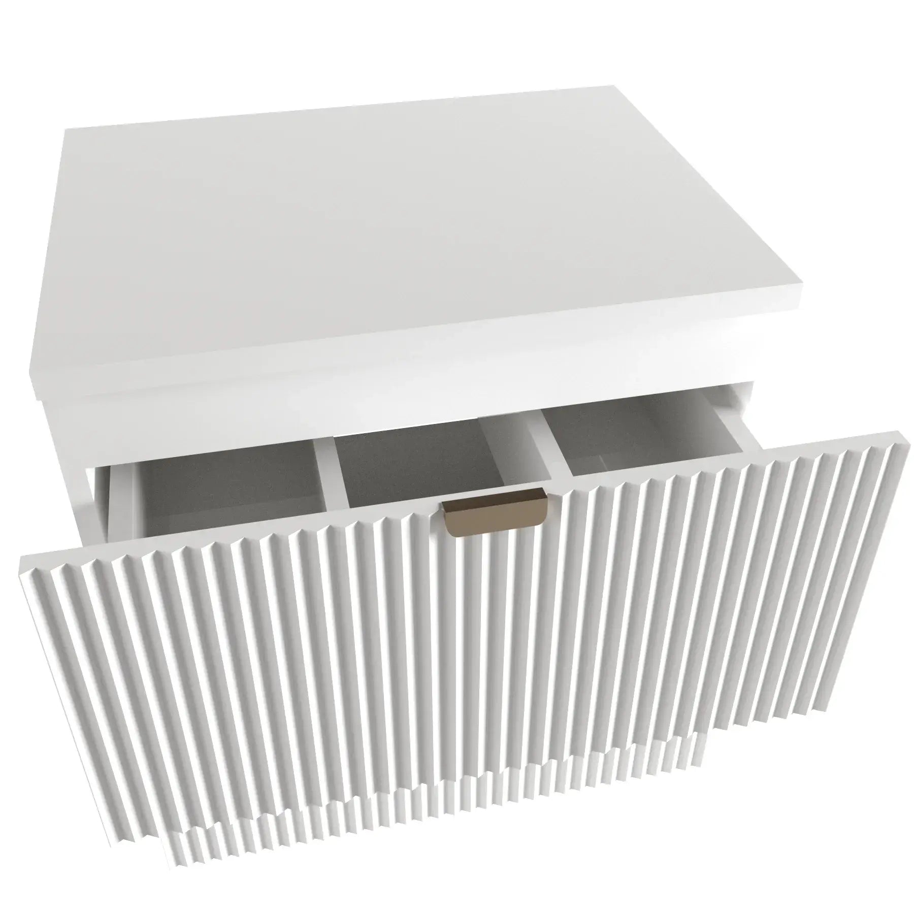 Fronturile riflate adaugă textură și un aspect modern, în timp ce mânerele metalice aurii oferă o notă luxoasă și completează perfect designul minimalist. Cele două sertare cu sistem SOFT-CLOSE asigură o închidere lină și silențioasă, oferind confort sporit la utilizarea zilnică.