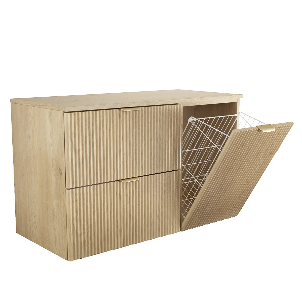 Dulap pentru lavoar 100 cm cu coș pentru rufe Willy – Stejar Cremona | Fronturi riliate și aspect natural de lemn pentru ordine elegantă