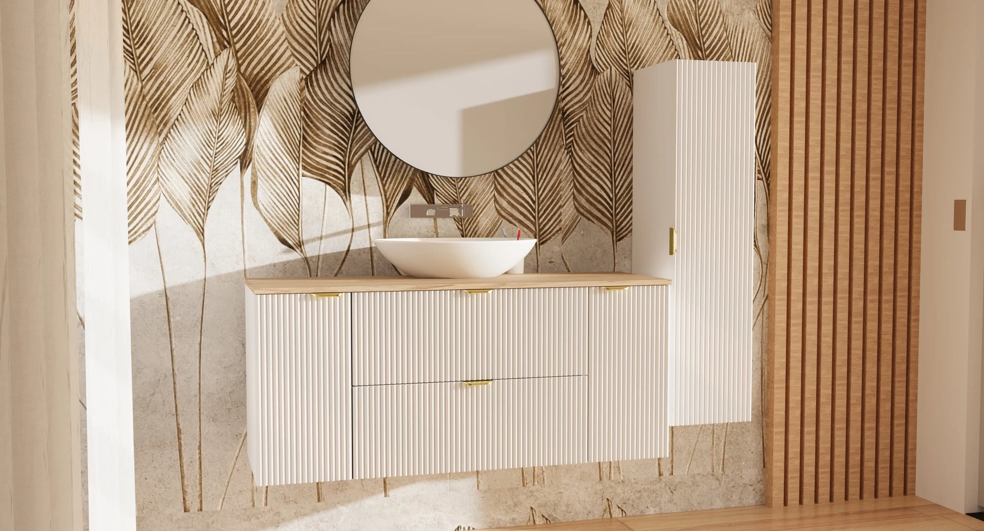 Dulapul pentru lavoar Willy îmbină designul modern cu funcționalitatea de înaltă calitate. Cu o lățime de 140 cm și o combinație elegantă între corpul alb și blatul din nuc, acest mobilier aduce o atmosferă armonioasă și rafinată în baia dumneavoastră. Fronturile riflate și mânerele metalice aurii oferă o notă luxoasă, transformând dulapul într-un adevărat punct de atracție.