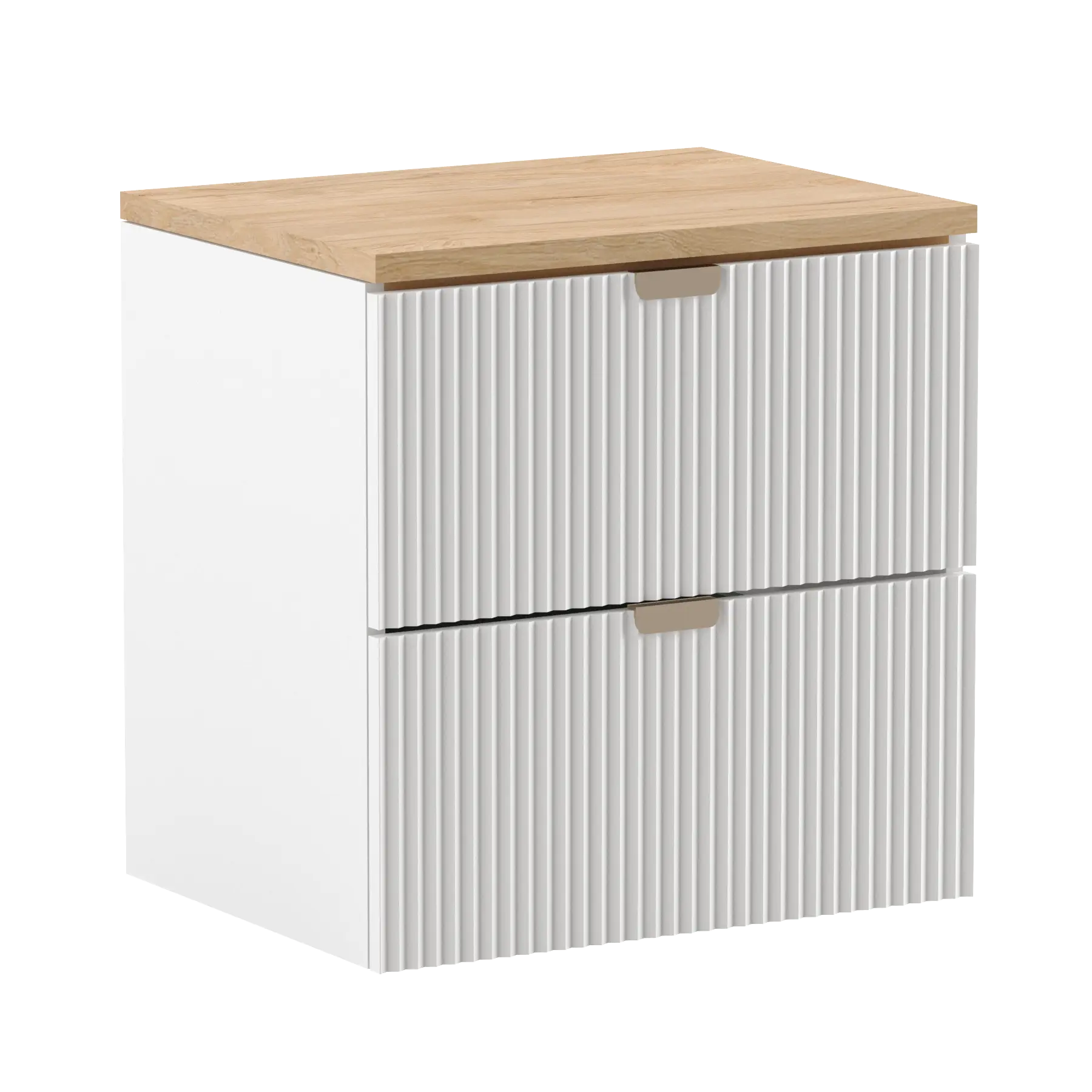 Dulap pentru lavoar 140 cm cu raft Willy – Alb cu raft și blat din Nuc | Fronturi striate și spațiu generos