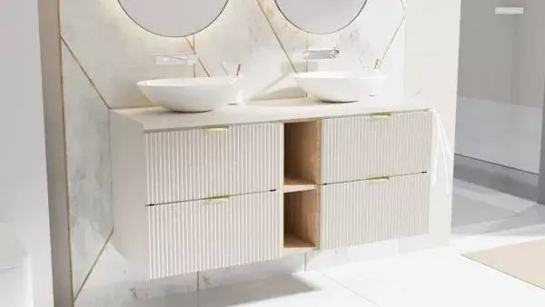 Optează pentru dulapul pentru lavoar Willy 140 cm – Cașmir cu raft din Nuc pentru a combina designul elegant cu soluții practice de depozitare, creând o baie modernă, ordonată și primitoare.