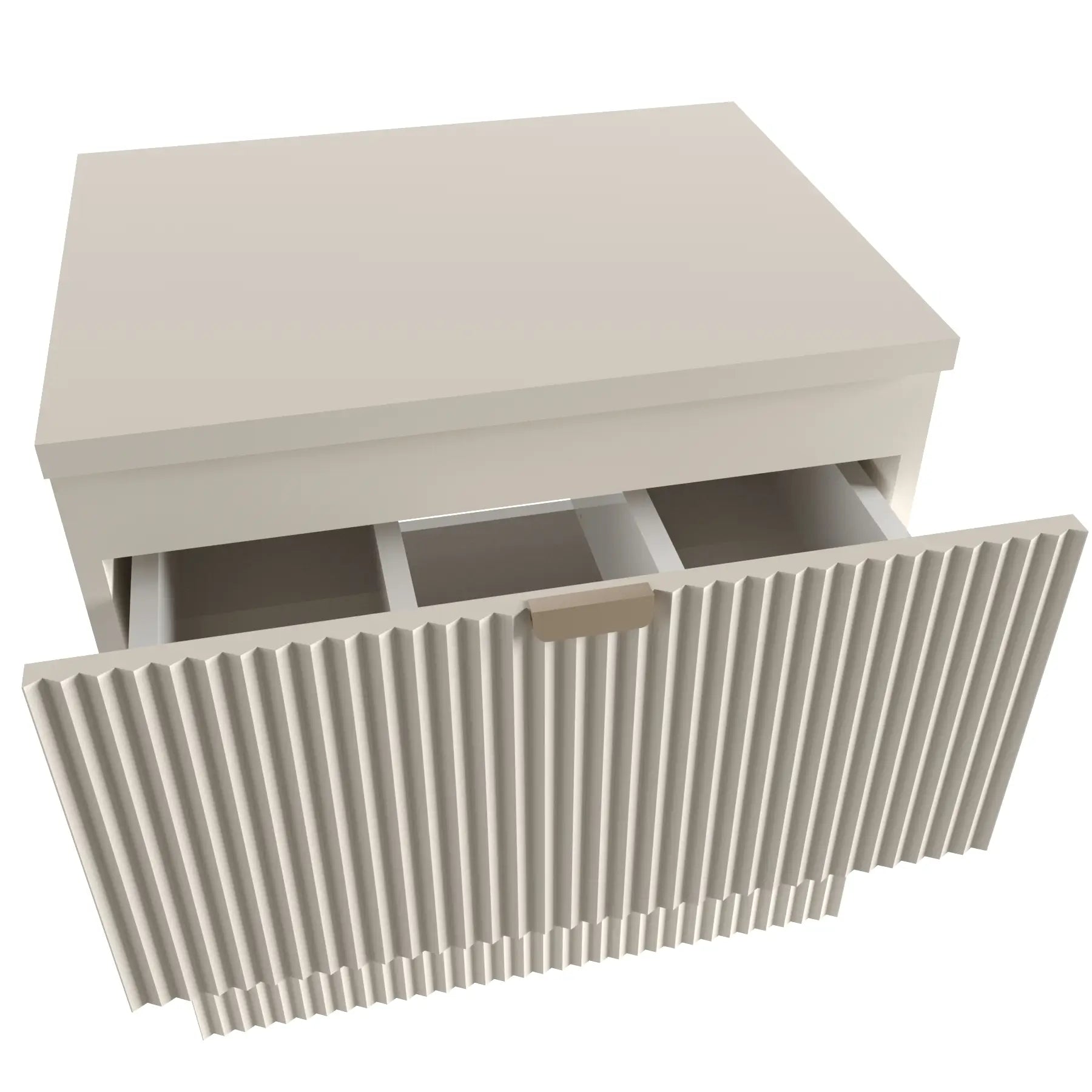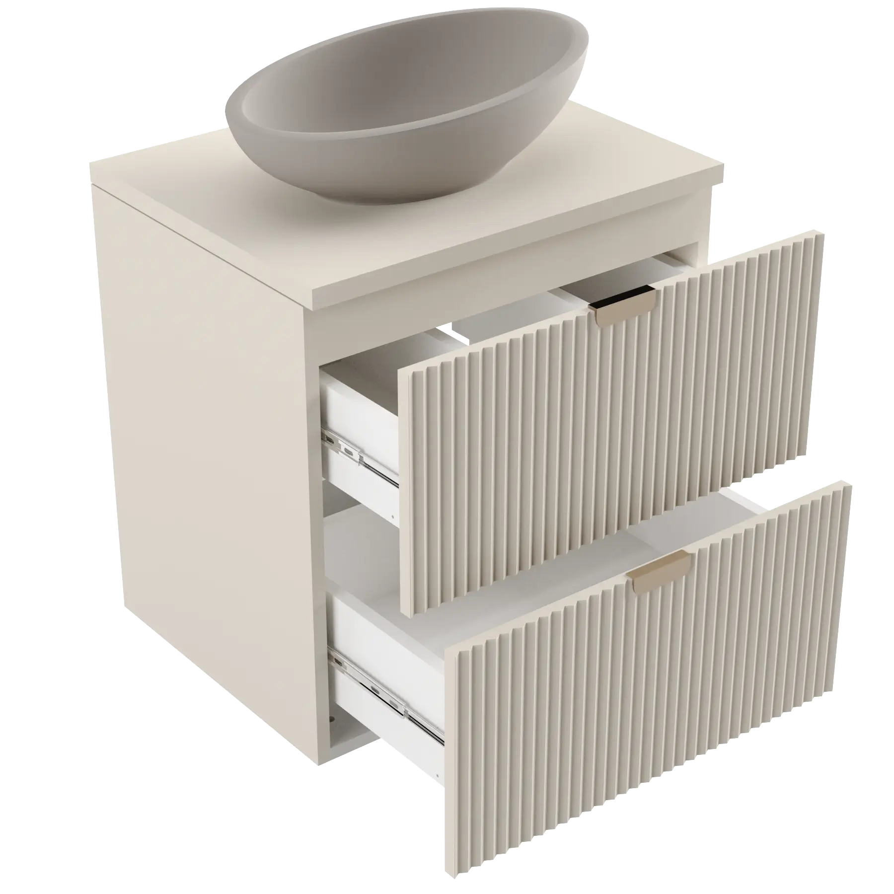 Finisajul complet în culoare Cașmir conferă dulapului un aer luxos și liniștitor, iar raftul lateral din Nuc adaugă un accent natural și primitor, perfect pentru o baie contemporană.